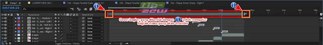 Setelah kalian klik tab atau komposisi, sekarang bisa geser bagian durasi atau panjang video di kolom timeline. Atau supaya lebih jelas, kalian bisa perhatikan contoh gambar di atas.